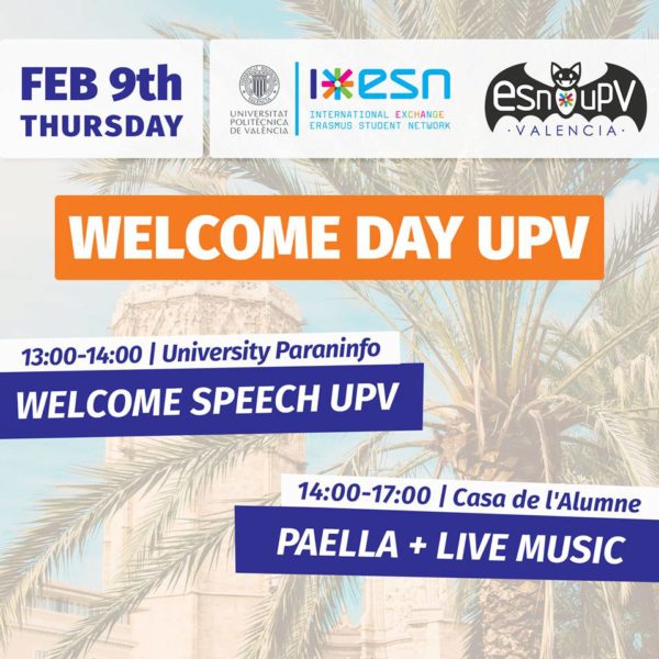 Erasmus Welcome Day UPV 2017 El pasado 9 de Febrero se recibió en la Casa del Alumno a los estudiantes Erasmus que comienzan su estancia el segundo cuatrimestre en la UPV. Se preparó paella y sangría y se animó la bienvenida con algo de música. Galería