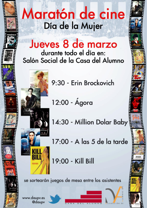 El próximo jueves día 8 de marzo, la Delegación de Alumnos celebrará el Día de la Dona, organizando una maratón de cine, con las ocho películas más votadas de la lista que se propone. Se sortearán regalos entre los participantes.
