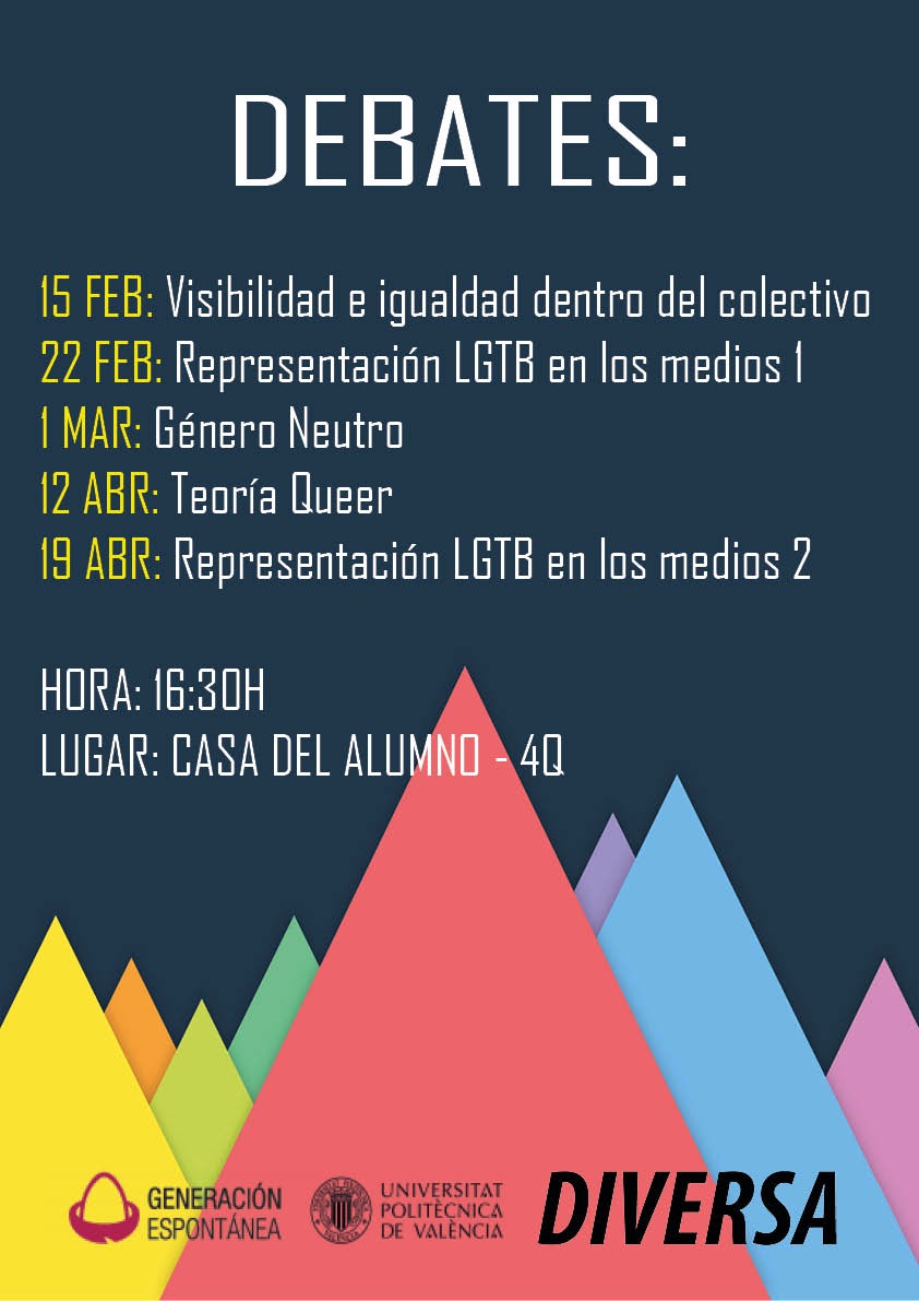 Debates Colectivo Diversa A partir de esta semana tendrá lugar en la casa del Alumno, diferentes debates ofrecidos por el colectivo Diversa Os dejamos con el cartel de cada debate y su respectivo día y lugar. Debate 15 de febrero Debate 22 de febrero Debate 23 de marzo Debate 12 de abril *